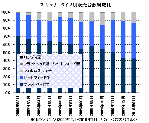 実際、「BCNランキング」のデータでも、シートフィード型の伸びは明らかだ。直近1年間の推移をみると、09年2月のタイプ別販売台数構成比は、紙をガラス面に置いて下から光を当てて読み取る「フラットベッド型」が70.4%、シートフィード型は28.2%だった。その後、シートフィード型が緩やかに拡大し、12月は構成比がついに逆転。10年1月には44.6%と過半数近くまでシートフィード型の規模は広がった。一方、フラットベッド型は42.4%だった。