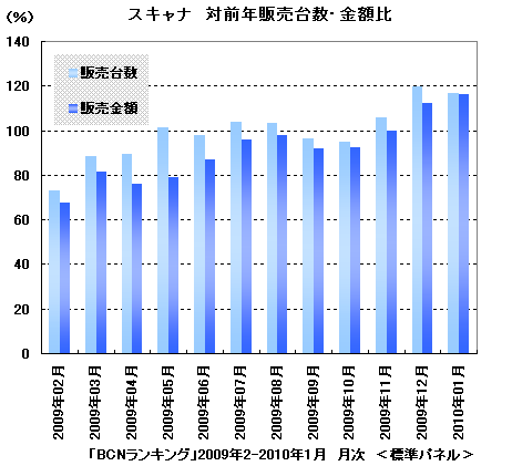 シートフィード型の動きは、スキャナ市場全体にも影響を与えている。1年前の09年2月の対前年同期比は、販売台数72.9%、金額67.6%と前年割れしていた。しかし、その後市場は徐々に回復し、12月は前年を超えた。10年1月には台数116.5%、金額116%と勢いをみせている。