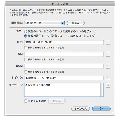 また、メール送信も便利な新機能の一つだ。従来のバージョンでは、外部メールソフトで送信しなければならなかったが、FileMaker Pro 10は直接SMTPプロトコルを扱えるようになり、ダイレクトにメールを送信できるようになった。メールソフトとの相性問題を考慮する必要がなくなり、メール送信の利便性が向上した。顧客データベースに蓄積したアドレスあてにメールマガジンを一括送信する、といった処理がスマートに処理できるようになったのだ。