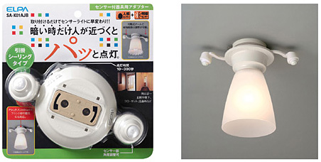 天井に付いている引掛シーリングと照明器具の間にアダプタを挟めば、照明器具がセンサーライトになる。人がいない時には自動的に消灯し、人が近づけば点灯する。