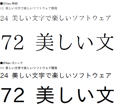 新シリーズ「IPAexフォント」では、日本語文書を作成する際の利便性向上のため、新たに固定幅と変動幅を一つのフォントに統合した「IPAex明朝」「IPAexゴシック」を開発。和文文字(仮名、約モノ、漢字)は固定幅で、欧文文字は文字幅に合わせた幅(変動幅)を基本とし、文字に応じてフォントを使い分けるわずらわしさを解消した。