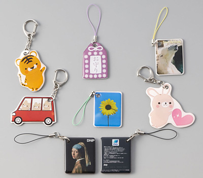 最小サイズは45×38mm、厚さは約6mm。キャラクターやブランドロゴなど、提供するサービスイメージに合ったデザインや形状に加工し、会員証やIDカードとして活用できる。絵柄を印刷したフィルムの表面を透明樹脂でコーティングすることで、立体感もつけられる。従来品の金型を用いた製造方法と比較して、低価格・短納期で提供する。