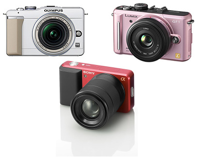 上部左から時計回りに、OLYMPUS PEN(ホワイト)、LUMIX GF1(フェアリーピンク)、開発中のソニー「レンズ交換式小型カメラ」のコンセプトイメージ