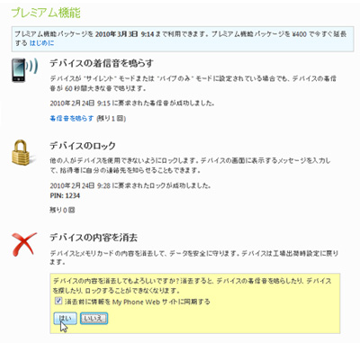 「My Phone」で現在位置を同期していると、PCのウェブブラウザ上からおおよその場所を検索できる。端末を失くしたときに助かる機能だ。このほか、NTTドコモのWindows Phoneでは「プレミアムサービス」が利用できる。デバイスの着信音を鳴らす、デバイスをロックする、デバイスの内容を消去の3機能が用意されており、400円で7日間利用できる。地図で検索して、会社や家の中にあることがわかったら、着信音を鳴らそう。この機能では、端末がサイレントやバイブモードになっていても音が鳴るので、見つけやすい。手の届く範囲にないなら、デバイスをロックしよう。ロックする際、52文字までメッセージを表示できるので、自分の電話番号などを取得者に通知する手もある。端末が見つかりそうになく、情報の漏洩を防ぎたいなら、工場出荷時の設定にリセットできる。万一の時に頼れるサービスだ。