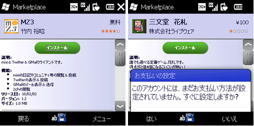 Windows Live IDを登録すれば、「Windows Marketplace for Mobile」からアプリケーションをダウンロード&インストールできる。有料アプリを購入するときは、クレジットカードの登録が必要だ。現在のところ、ゲームカテゴリが一番充実しているが、「仕事効率化」や「ソーシャルネットワーク」「コミュニケーション」といったカテゴリにも7-10本のアプリが登録されている。インストールはアプリの紹介画面からワンクリックでできるので、無料ソフトなら気軽に試せる。