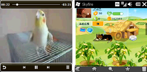 「SkyFire」をインストールすれば、マルチメディア再生ソフト「Kinoma Play」でYouTube動画を楽しめる(左)、外出先でもmixiアプリ「サンシャイン牧場」の畜産が管理できる(右)