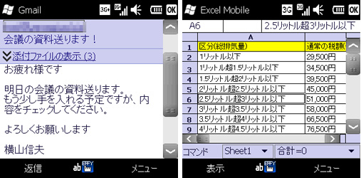 メールの添付ファイルを直接開ける(左)、Excel Mobileでワークシートを編集できる(右)