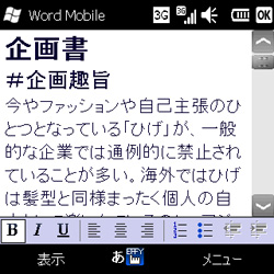 Windows Mobileが搭載する「Office Mobile」は、ワードやエクセル、パワーポイントの文書ファイルを閲覧・編集できる。Office 2007のファイルに対応しており、出先で文書のチェックや簡単な修正が可能だ。本来なら会社に戻らなければできなかった作業を外出先で処理できれば、直帰できるかもしれない。エクセルはマクロが動作しない、ワードの凝ったデザインは表示できないなど、制約もあるが、一般的なビジネス文書なら問題ないだろう。