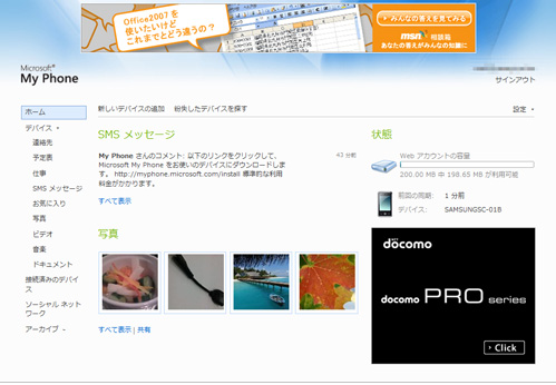 「SC-01B」は、このほか「My Phone」というオンラインデータ保存サービスに対応している。連絡先や予定、仕事、写真、SMSメッセージ、お気に入り、ビデオ、音楽、ドキュメントなどをネット上に保存し、PC上からアクセスしたり、端末に復元したりできる。無料だが、利用するにはWindows Live IDが必要だ。
