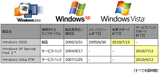 マイクロソフトは、米国時間の4月13日にWindows Vista RTM(製品初期版)、7月13日にWindows XP Service Pack 2とWindows 2000の製品サポートを終了する。これによって、セキュリティ更新プログラムのサポート、有償サポート(インシデントサポート、時間制サポート)、仕様変更、新機能のリクエストなど、すべてのサポートが終了する。