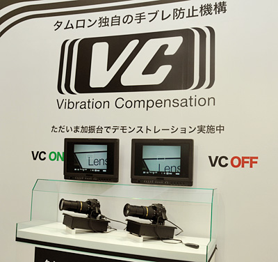 ブースには、独自開発の手ブレ防止機構「VC」のコーナーも設置。VC搭載レンズを付けたカメラ2台を並べ、台座を揺らして、機能オン状態とオフ状態の違いがわかるデモを行っている。