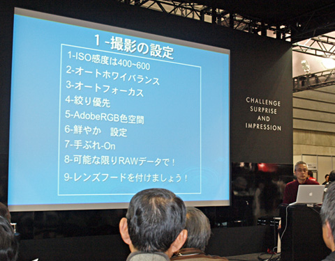イベント会場では写真家・色評価士の小林宗正さんが、有効約1460万画素のハイアマチュア向けデジタル一眼レフカメラ「PENTAX K-7」を使いこなすためのノウハウと、撮影した写真をプリントするまでの手順を来場者にわかりやすく伝えていた。