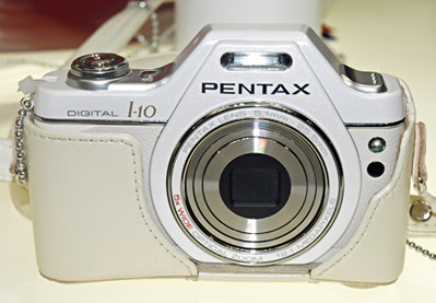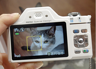 コンパクトデジタルカメラの展示では、一眼レフ風デザインの「PENTAX Optio I-10」の、登録したペットが正面を向いたときに自動でシャッターを切る「ペット検出機能」を、猫の写真を使って体感できる。