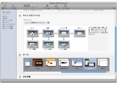 さらにFileMaker Server 10は、「PHP Site Assistant」というWebサイト構築支援ツールを用意する。ウィザード形式の画面に従って作業を進めるだけでよく、画面デザイン(テーマ)にはPCブラウザ向けが10種類、iPhone向け用が1種類揃っているので、見映えに悩むことなくサイトを立ちあげることができる。
