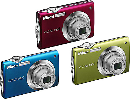 上から「COOLPIX S4000」のルビーレッド、「COOLPIX S3000」のアクアブルー、ポップグリーン