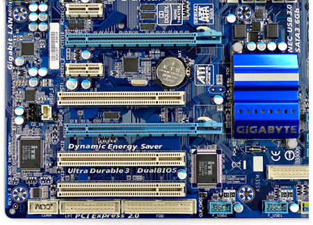 そのほかのコンポーネントにも目を向けよう。コネクタは、USB3.0を2ポート以外にUSB2.0を10ポートを備える。HDDインターフェースはSerial ATA 3.0を2ポート、Serial ATA 2.5を6ポート、eSATA(Serial ATA 2.5)を2ポート、そしてUltra ATA/133のパラレルコネクタが1基と必要十分。拡張スロットはPCI Express 2.0x16を1スロット、PCI Express 2.0x4を1スロット、PCI Express 2.0x1を2スロット、PCIを3スロット備え、長期を見据えた拡張計画にも余裕をもって対応できる。