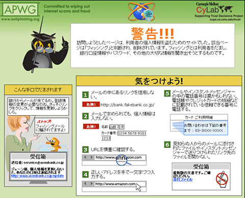 「フクロウ先生のフィッシング警告ページ」のサンプル