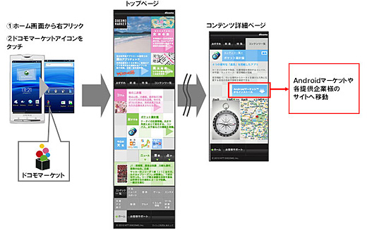 NTTドコモは、スマートフォン向けのポータルサイト「ドコモマーケット」を4月1日に開設する。ソニー・エリクソン・モバイルコミュニケーションズ製のスマートフォン「Xperia」の販売に伴いスタートする。月額利用料は無料で、別途パケット通信料が必要。