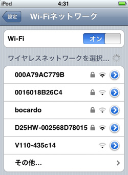 「Pocket WiFi」には、電源のオン/オフ、無線LANのオン/オフ、ネットの接続/切断の三つのボタンがある。電源を入れて、iPod touchで「設定」→「Wi-Fi」を開くと、「ワイヤレスネットワークを選択」の一覧に「D25HW-**********」といったSSIDが表示される。購入した「Pocket WiFi」にあらかじめ設定されている5桁のパスワードを入力すれば、接続完了。これでネットが利用できる。