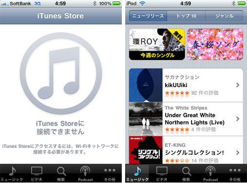iPhone単体ではiTunes Storeが利用できない(左)が、「Pocket WiFi」を使えばOK(右)