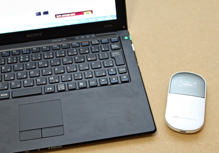 ノートPCからでも、もちろんネット接続できる。接続方法はiPod touchと同じで、SSIDを選択してパスワードを入力するだけ。「Pocket WiFi」はバッグに入れたまま、テーブルにはノートPCだけを出してネットを利用できる。貴重なUSB端子をふさがず、ノートPCからUSB通信アダプタがはみ出すこともなく、非常にスマートだ。