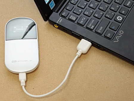 「Pocket WiFi」のバッテリ駆動時間は、カタログ値で約4時間。実働では4時間よりやや短く感じた。外出先でバッテリの減りが気になるなら、ノートPCに付属のUSBケーブルで接続すればいい。内蔵メモリにドライバを収録しているので、光学ドライブのないネットブックなどでも、ケーブルでつなぐだけでセットアップできる。USBで接続すると給電しながら通信するので、バッテリを消費せずに済む。ただ、通信中は充電できない。充電するには、3G通信もしくは電源をオフにする必要がある。USB接続の場合、充電時間は6時間と長いので、通信しながら充電できるとさらによかった。ちなみに、付属のACアダプタをつないだときは、通信と充電を同時にできる。