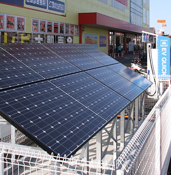 「大阪EVアクションプログラム」は、09年6月設立の大阪EVアクション協議会が主体となって取り組む環境事業。現在、大阪府内に電気自動車の充電設備を複数設置しており、ジョーシン岸和田店の充電設備もその一つ。今回は、太陽光発電システムを併設する。利用料は無料。