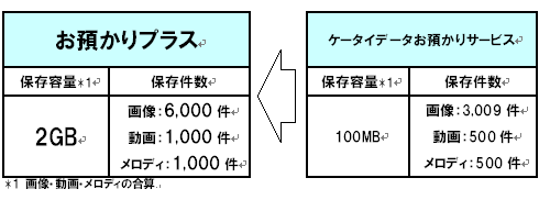 「お預かりプラス」は、このサービスを利用してバックアップできるデータのうち、「画像・動画・メロディ」の保存容量を増やすオプション。通常は画像3009件、動画500件、メロディ500件の計100MBまでしか保存できないが、「お預かりプラス」を契約すれば、画像6000件、動画1000件、メロディ1000件の計2GBまで保存することができる。
