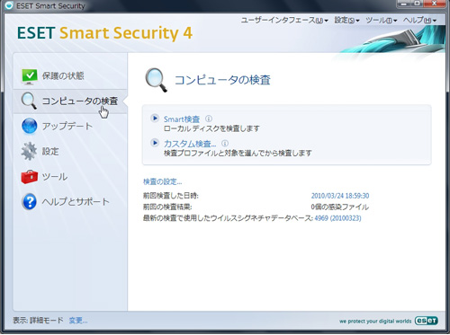 PCがウイルスやスパイウェアに感染しているかを調べるには、左の「コンピュータの検査」メニューを選び、「Smart検査」または「カスタム検査」をクリックする。「Smart検査」は、検査パラメータを設定することなく、簡単にシステムスキャンするモード。「カスタム検査」は、あらかじめ定義されたスキャンプロファイルを選択して、システムスキャンするモードだ。また、任意のフォルダやドライブ、リムーバブルディスクのスキャンにも対応する。