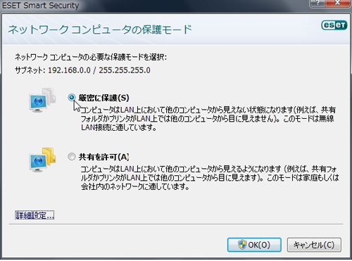 外部のパブリックネットワークに接続すると、ダイアログが現れてユーザーに選択を促してくる。ホテルや駅など、公共のネットワークの場合は「厳密に保護」を選べば、PCは他のPCから一切見えない状態になって、不正なアクセスを遮断する。もちろん、ウェブ閲覧やメールの送受信などはできる。また、オフィスや自宅のネットワークに接続したいときは「共有を許可」を選べば、プリンタやデータの共有もできる。