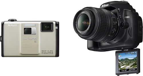 「D5000」は、09年5月発売の初心者向けデジタル一眼レフカメラ。センサーに有効1230万画素のCMOSを採用し、ニコンのデジタル一眼レフカメラで初のバリアングル液晶モニターを搭載した。