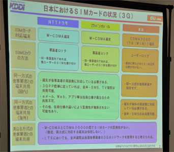 KDDIは、携帯電話のSIMロック解除に関して、積極的には取り組んでいかない方針を明らかにした。携帯電話の「ID」となるSIMカードのロックを解除すれば、原理的には1台の端末で複数キャリアのサービスを利用できるようになるが、現時点では各キャリアが使用する通信方式や周波数帯が違うなどの理由から、ユーザーメリットが生じないと判断したもの。