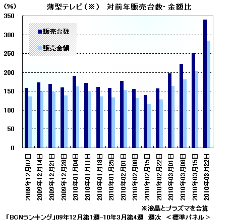 2010年4月1日から、家電エコポイント制度が一部変更になった。薄型テレビには、より高い省エネ基準が設定された結果、一部の製品は4月からエコポイント対象外になった。3月は対象から除外されるモデルに人気が集中し、市場は盛り上がった。「BCNランキング」と家電量販店の店頭での取り組みを中心に、3月の薄型テレビの動向を追った。