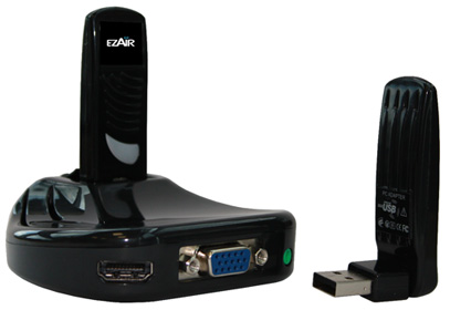 ウィザージャパンは、新しく立ち上げた「EZAIR(イージーエアー)」ブランドから、超広帯域無線技術「ウルトラワイドバンド(UWB)」でPCとテレビ・プロジェクターをワイヤレスでつなぎ、PCの画面やハイビジョン(HD)動画を大画面で見ることができるワイヤレスAVキット「EZR601AV」を4月12日に発売する。価格はオープンで、実勢価格は1万3800円前後の見込み。