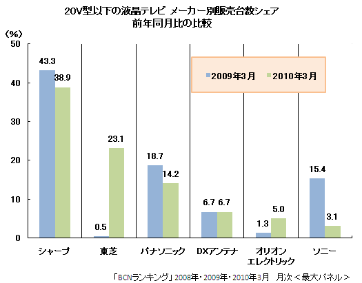 2010年3月の20V型以下の小型テレビのランキングは、19V、20V型がトップ10を占めた。メーカー別でシェアをみると、トップはシャープで不動だが、シェアは38.9%で前年同月に比べて4.4ポイント後退している。一方、2位の東芝は、前年同月の0.5%から大躍進し、23.1%を獲得した。3位は14.2%でパナソニックとなっている。