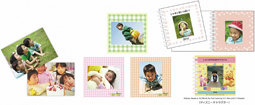プリントは、89×127mmの「Lサイズプリント」に加え、多彩なテンプレートと合成する「正方形サイズプリント」、10ページ立てのミニ写真集「フォトブックスクエア ミニ」の3種類を揃える。「フォトブックスクエア ミニ」は、スタンダードタイプと、ディズニーキャラクターのデザイン、計14種類から選択。正方形サイズとフォトブックスクエア ミニのサイズはともに89×89mm。