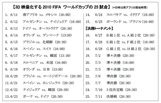 3D映像化する2010 FIFA ワールドカップの25試合(日時は現地時間)