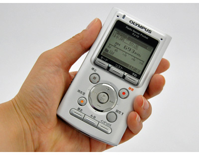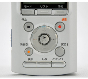 まずは、ボタンの操作性をチェックする。「録音」「再生」「音量調節」など、電源以外の基本操作をするボタンがすべて前面にあるのは、親指一本で押せるので使いやすい。ちょうど、ひとまわり大きな携帯電話を触っているような感覚だ。また、一般的なICレコーダーと比べるとボタンと液晶画面が大きく、見やすい。主要な操作では、一度も取扱説明書を開くことなく、迷わず目的の機能にたどり着くことができた。