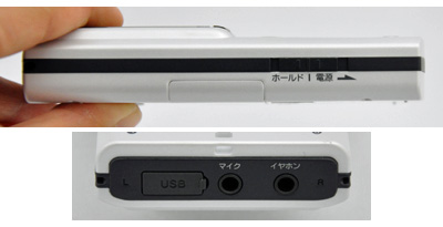 側面にはスライド式の電源ボタン、上面にはUSB端子、マイク端子、イヤホン端子を備える
