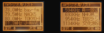 FM・AM放送局を変更したい場合は、液晶画面の下の中央にあるリストボタンを使う。放送局と周波数を一覧で表示するので、迷うことなく聴きたい放送局を選択できる。放送局名が長い場合は、件名がスクロールする。もちろん、手動で周波数を調節することもできる。受信中に、前面にある左右の矢印ボタンを操作する。FM・AMともに、画面上で目盛り付きの周波数表示があるので、いまどの放送局を受信しているのかひと目でわかる。