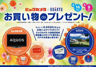 ビックカメラと小田急百貨店は、ビックカメラ新宿西口店(2-6階)と小田急百貨店新宿店本館(1-10階)、ハルク(地下1-2階)で5000円以上の買い物をした人を対象に、抽選で箱根旅行や液晶テレビなどが当たる合同キャンペーン「小田急百貨店新宿店×ビックカメラ新宿西口店 お買い物deプレゼント!」を、4月14日に開始する。期間は5月9日まで。