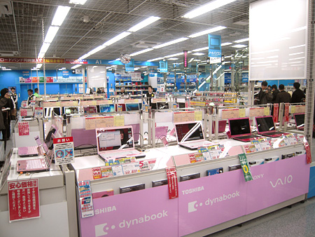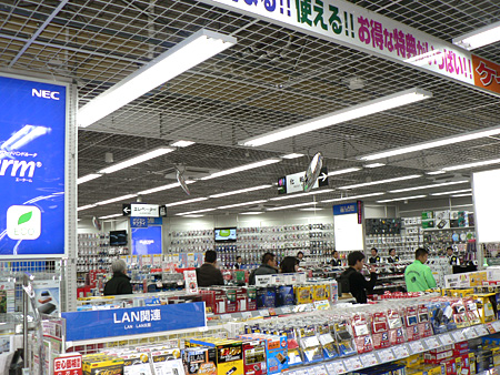 2階には携帯電話やデジカメに加え、デコレーションパーツ売り場と注文カウンターを設置。3階はパソコン・プリンタ売り場で、ピンク色のパソコンだけを集めたコーナーも設けた。4階はパソコンソフト・周辺機器売り場と法人窓口がある。5-6階はエアコンや白物家電、7階はゲーム機器売り場。ゲームソフトコーナーでは、女性に人気のあるソフトを通路側に置いて露出を高めている。