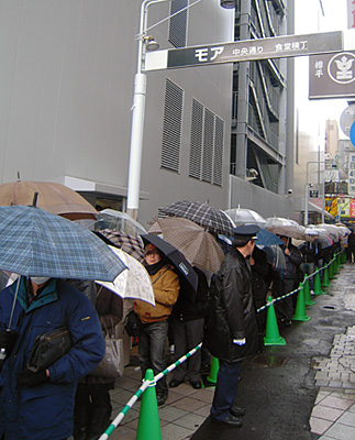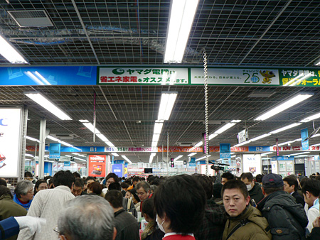 その後、一宮忠男社長や中山区長らがテープカットを行い、オープン。1万人の行列は、順番に館内に案内された。10時半を過ぎる頃には、1階のテレビ、2階のデジカメ、3階のパソコン売り場は人々で埋め尽くされ、身動きが取れないほどの混雑。売り場は、目玉商品を探す人々と会計を待つ行列でごった返した。