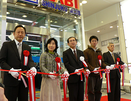 10時の開店直前のオープンニングセレモニーには、一宮忠男社長、中山弘子・新宿区長、蛭川和勇・新宿駅前商店街新興組合理事長、磯崎元彦・ユニカ社長、顧客代表が出席。一宮社長は、明るく、楽しく、やさしい売り場をコンセプトに女性をターゲットにした家電から化粧品まで取り揃えた新店のコンセプトを説明するとともに、「今後は、新宿東口の新たなランドマークとして選ばれるようになっていきたい。そして、街づくりに貢献していきたい」と挨拶した。