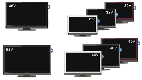 (左側上段LC-46DX3-B、下段LC-52DX3-B、右側上段左よりLC-32DX3-W、LC-32DX3-B、LC-32DX3-R、右側下段左よりLC-40DX3-W、LC-40DX3-B、LC-40DX3-R)