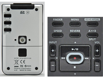 背面左上部には、マイクの入力感度をL(低感度)とH(高感度)に切り替える「マイクゲイン」を配置。さらに、入力時の音が大きすぎたときに、適度なレベルまで圧縮して歪みを抑える「リミッター」、低音域をカットしてノイズを抑える「ローカット」のスイッチを備える。これら二つのスイッチは、通常はオフにしておく。電源は単三形乾電池2本。三脚用の穴が付いている。