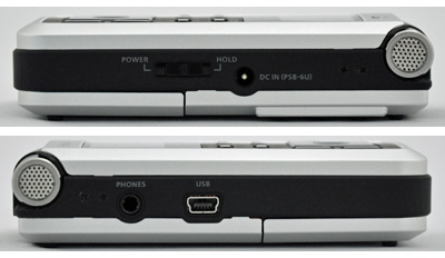 側面には(写真上)電源スイッチ、電源端子、(同下)イヤホン端子、ミニUSB端子を備える