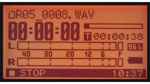 ここで、再生時の画面を例に、モニタの基本情報を確認する。最上部にはファイル名、その下の数字と帯は経過時間を示している。「L」「R」は、録音時なら左右のマイクの入力レベル、再生時なら出力レベルをそれぞれ指す。帯の右側の「P」はピークの略。このピークに達してしまうと、マイク入力の最大音量を超したことになり、音源本来の音質や音量で記録されない。ピーク手前の、できるだけ大きな音で録音するよう心がけよう。ピークは、画面上のレベルメーターのほか、液晶画面右上に「PEAK」と表示のあるインジケータの点灯でも確認できる。