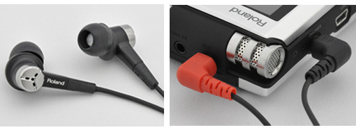 「CS-10EM」は、ケーブルが二つに枝分かれした先にコネクタを備え、ブラックがイヤホン端子、レッドがマイク端子になっている。それぞれを本体に挿入し、イヤホンを耳に付けて録音する。価格は9400円。「R-05」で使うときは、入力設定で「録音モニタ」をオン、「外部マイクタイプ」をステレオ、「プラグインパワー」をオンにして使用する。今回のレビューでは、音源から距離があるときに使った。