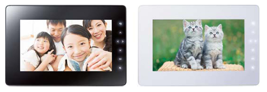 写真は、フォトフレームの縦置き・横置きを判別し、本体の向きに合わせて自動的に表示。表示方式は、写真が次々に切り替わるスライドショー、カレンダー/時計表示から選べる。内蔵メモリ容量は約384MBで、外部メモリとして、最大8GBまでのSD/SDHCメモリカード、最大2GBまでのマルチメディアカードに対応する。サイズは幅約263×高さ177×厚さ29mm、重さはスタンドを除いて約699g。カラーはブラックとホワイトの2色。